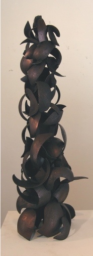 “Ripple” is a massing of blonde-colored gourd shards fastened with the lightest touches giving the sculpture a weightless feel. It evokes a pile of seaweed but is elegant and graceful. “Tarbaby”—made of tree-grown gourds from the Dominican Republic–could be a tower of black mussels clinging to a rock. It is totemic and airy. In “Bloom” the leather-dye stained shards seem to float and arc like Henri Matisse’s dancers in “La Danse.”