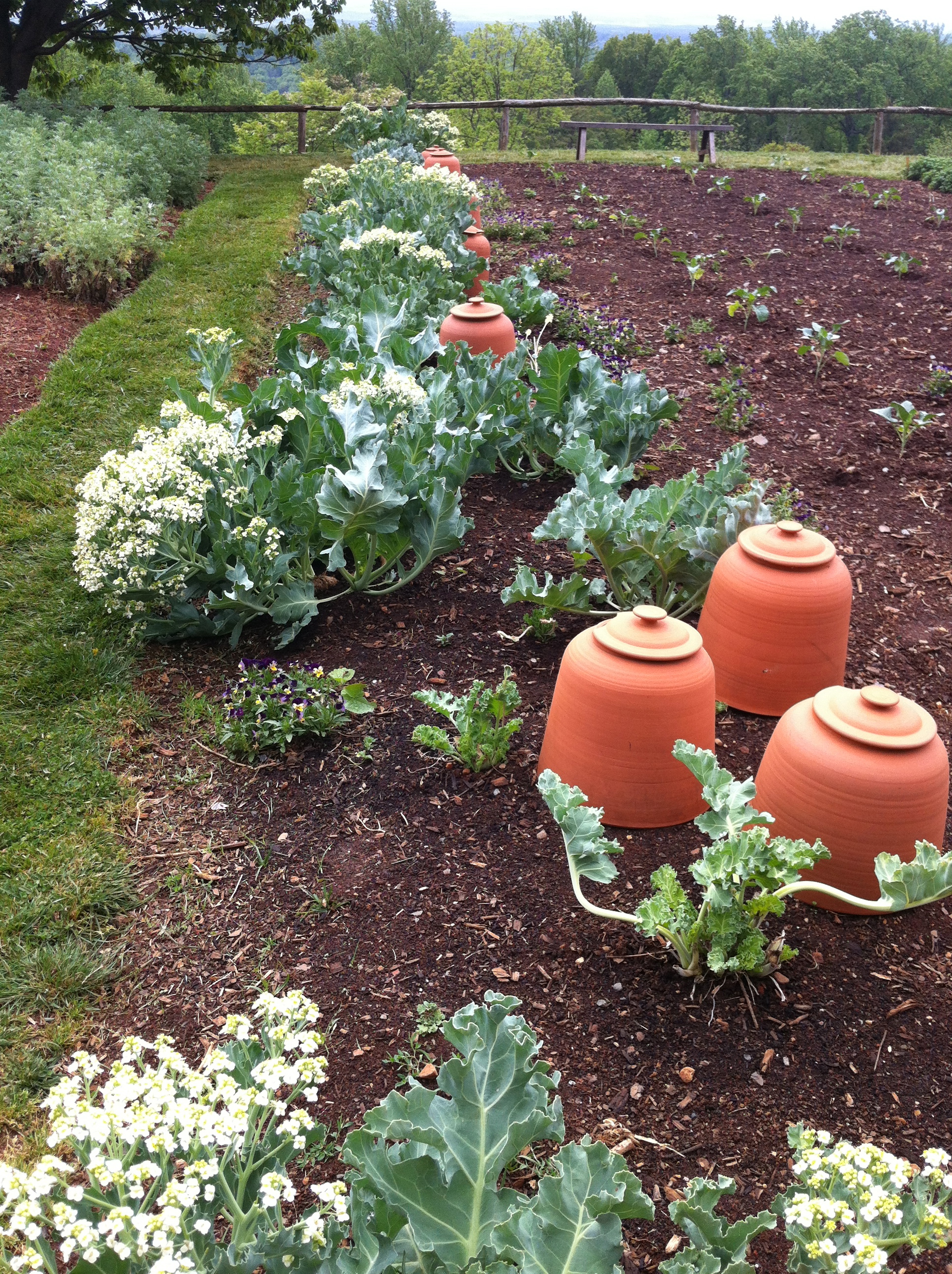 My favorite vegetable is the sea kale, at about the midpoint of the garden. It is a cabbage-like plant and native to the English seashore. At home in England, as its leaves start to unfurl in the spring, the winds cover it in sand. This coating enhances the flavor (“similar to asparagus,” says Peter) by blocking the chlorophyll and blanching the leaves leaving them virtually colorless and ethereal-looking. To recreate this blanching at Monticello, far from the sea, the plants are covered with clay pots in the winter months allowing the flavors to mellow and the color to be bleached out. The pots are removed when the plant reaches a mature height.