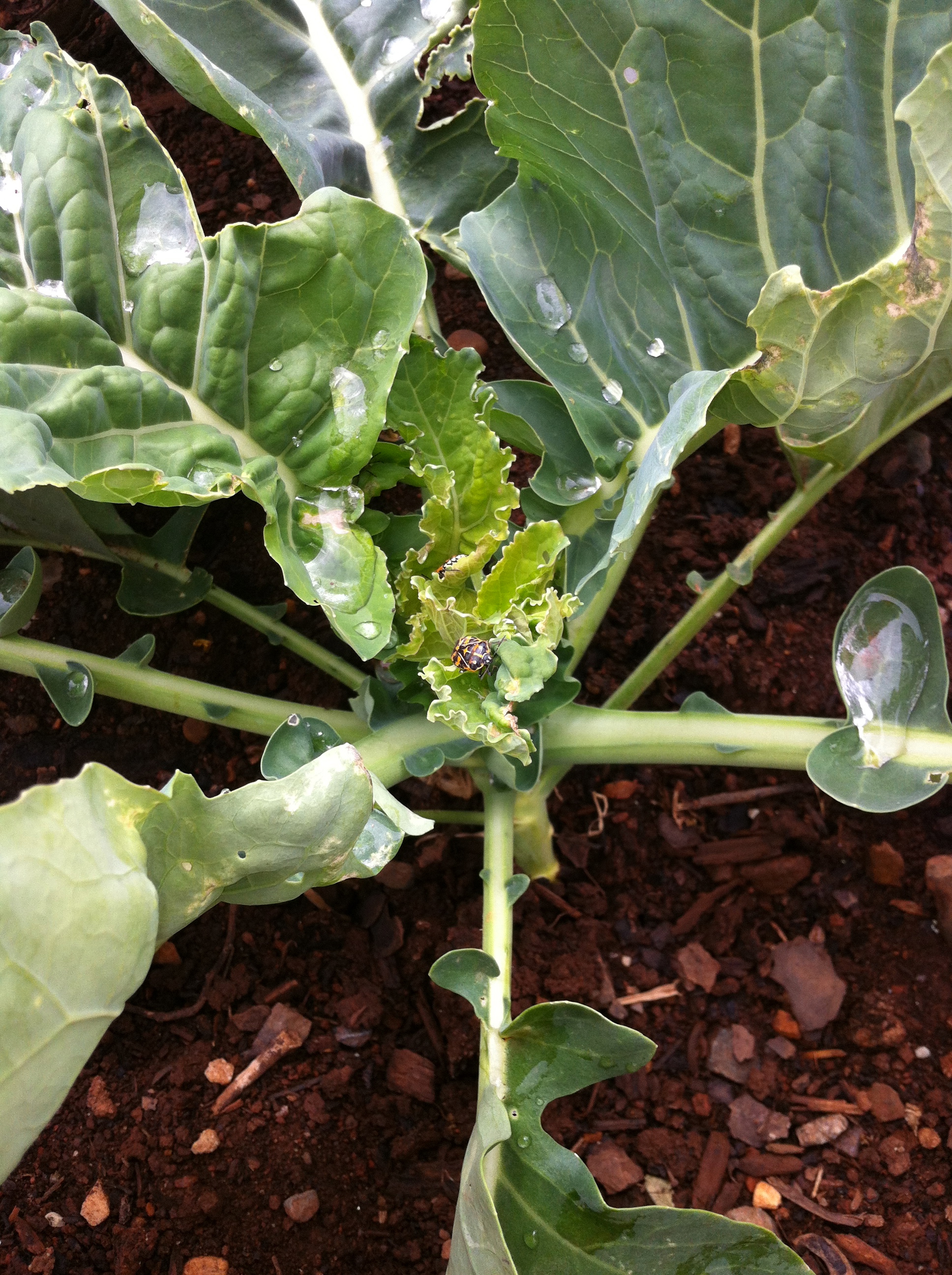 The garden is on a southeastern slope below the house. Rows of tennis ball lettuce grow on a terrace overlooking rolling hills. Asparagus stands tall at the western end of the garden. Lines of spinach, hanging onions, and turnip beets ripen in the sun as a harlequin bug drinks dew from a cabbage plant.
